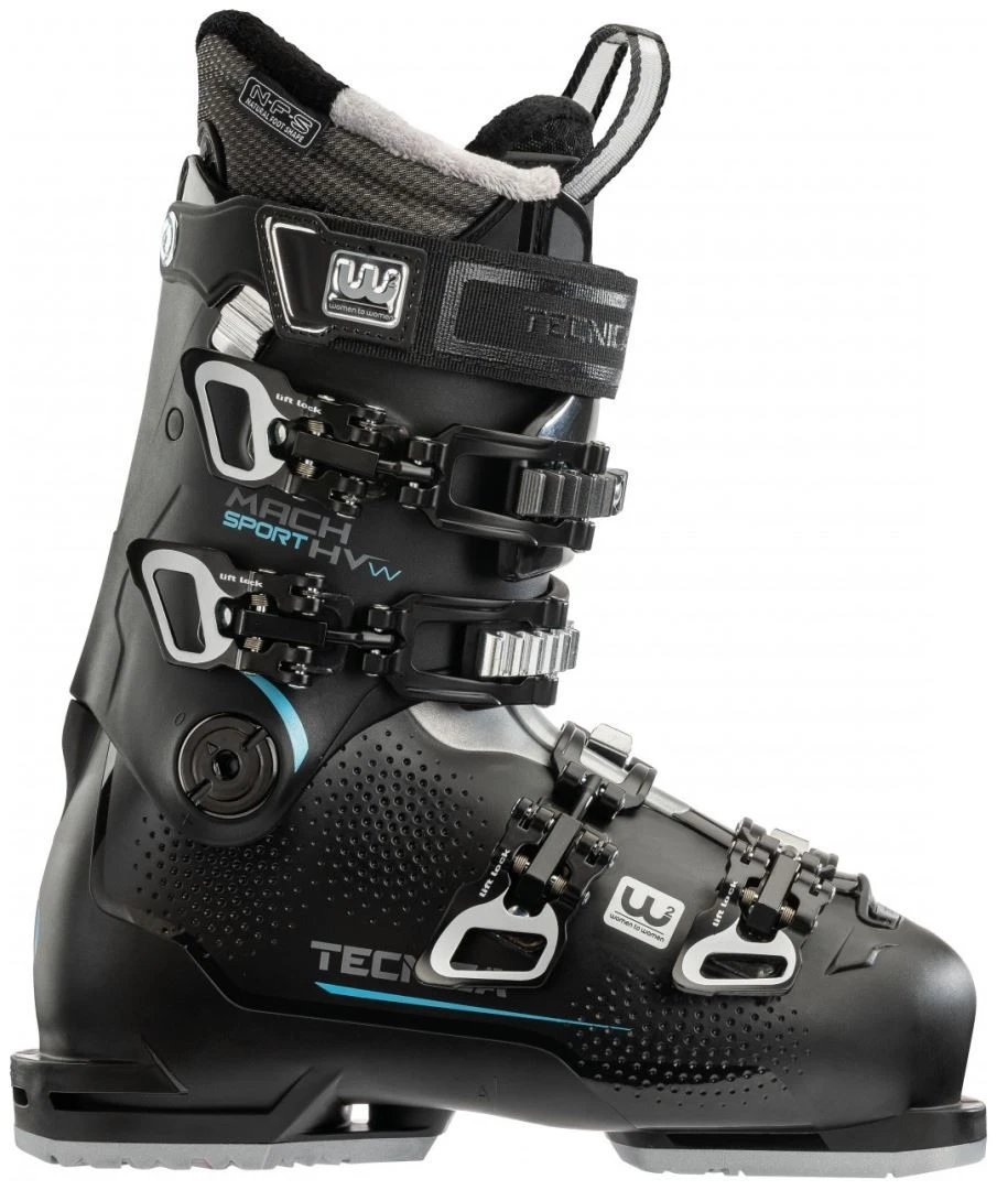 De Tecnica Mach Sport 85 HV Women is een skischoen met een hoog volume, geschikt voor voeten met veel breedte en een hoge wreef